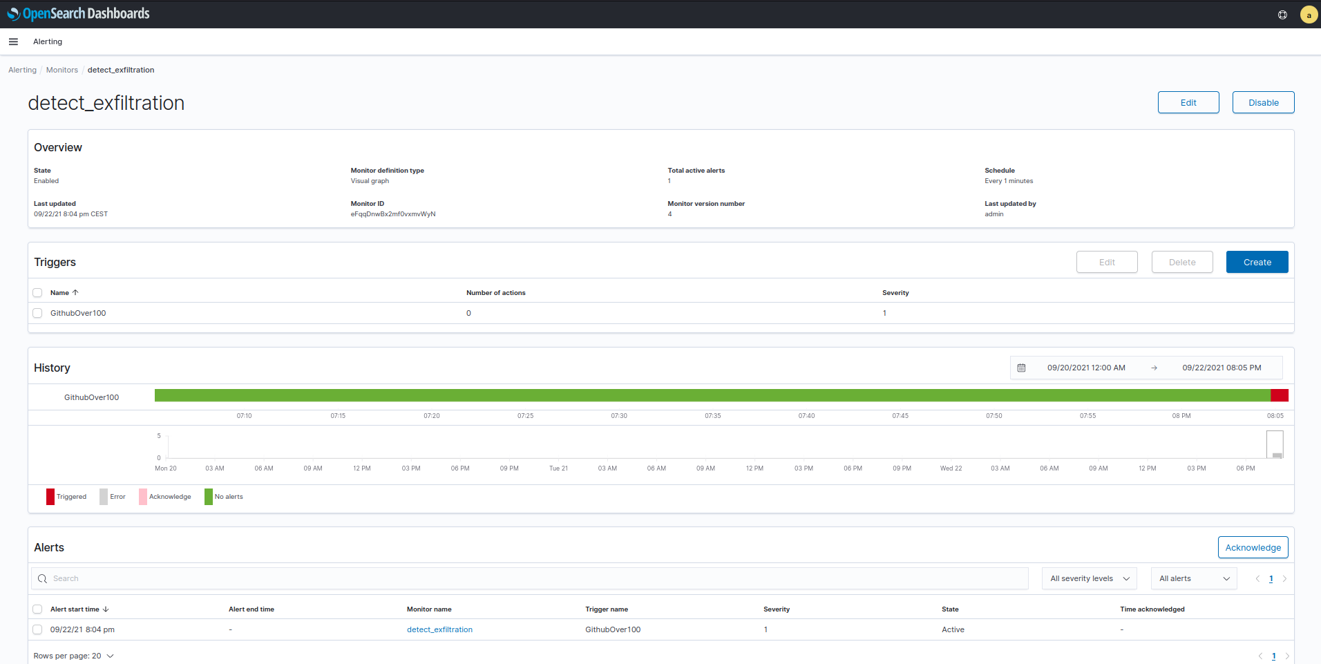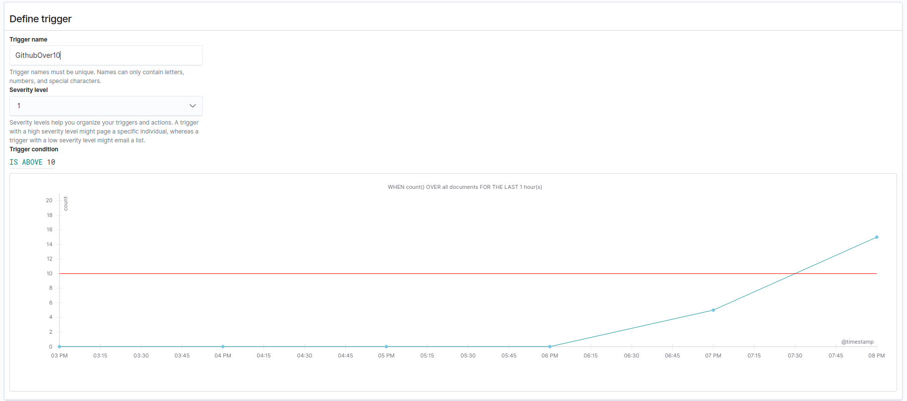 Por ejemplo una regla que detecta cuando hay más de 10 peticiones a github: