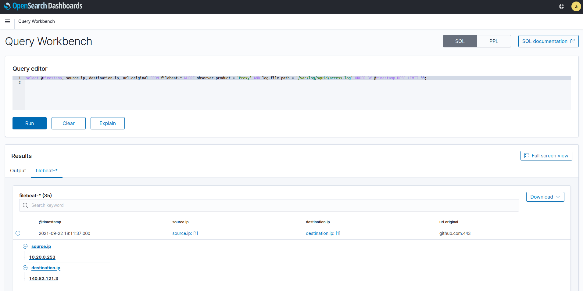 select @timestamp, source.ip, destination.ip, url.original FROM filebeat-* WHERE observer.product = 'Proxy' AND log.file.path = '/var/log/squid/access.log' ORDER BY @timestamp DESC LIMIT 50;