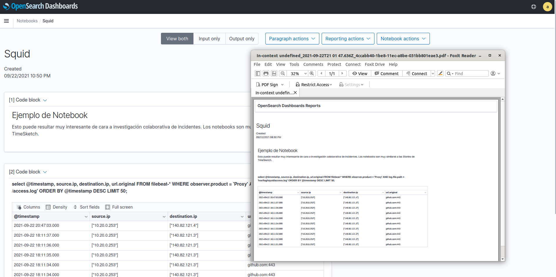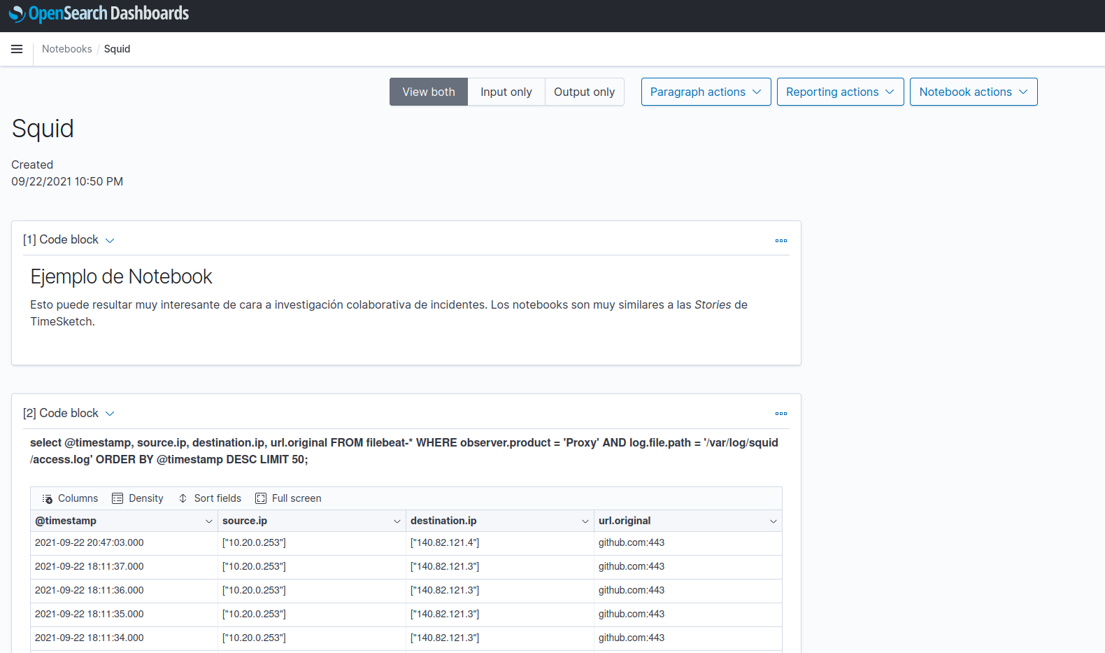 Básicamente un notebook nos va a permitir mantener de forma colaborativa un informe de un incidente pudiendo añadir los resultados de querys así como gráficos. Es muy similar a las stories de TimeSketch, aunque en este caso tendremos que controlar el tiempo absoluto de las querys ya que continuamente se están ingestando nuevos logs en el sistema.